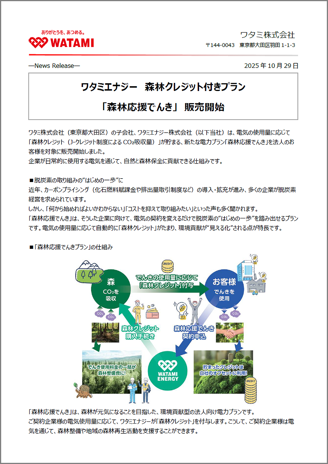 ワタミエナジーでは、電気の使用量に応じて「森林クレジット(J-クレジット制度によるCO₂吸収量)」が貯まる、新たな電力プラン「森林応援でんき」を法人のお客様を対象に販売開始しました。 企業が日常的に使用する電気を通じて、自然と森林保全に貢献できる仕組みです。