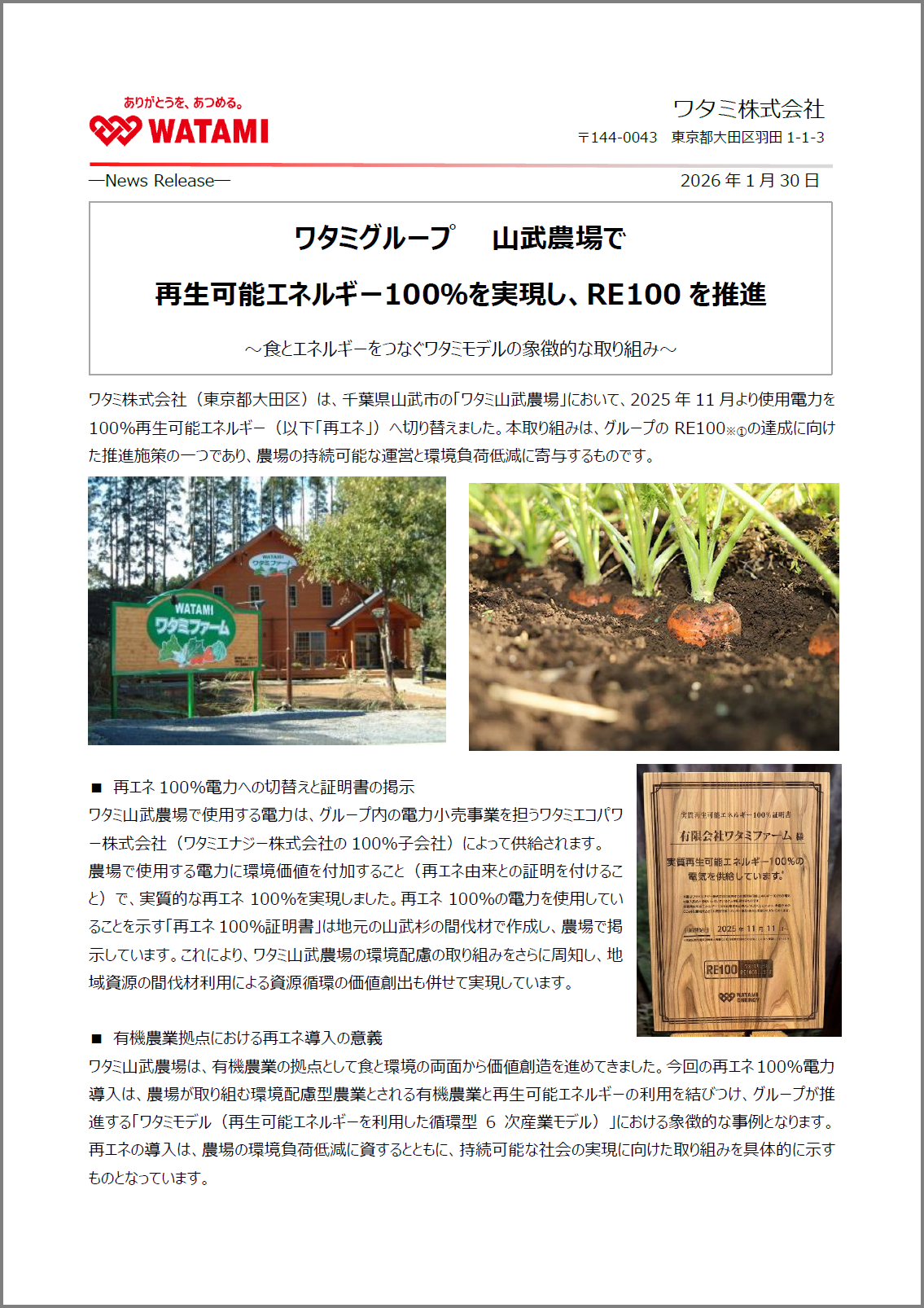 ワタミ株式会社は、千葉県山武市のワタミ山武農場において、2025年11月より使用電力を100%再生可能エネルギーへ切り替えました。本取り組みは、グループのRE100達成に向けた施策の一環であり、農場の持続可能な運営と環境負荷低減を目的としています。