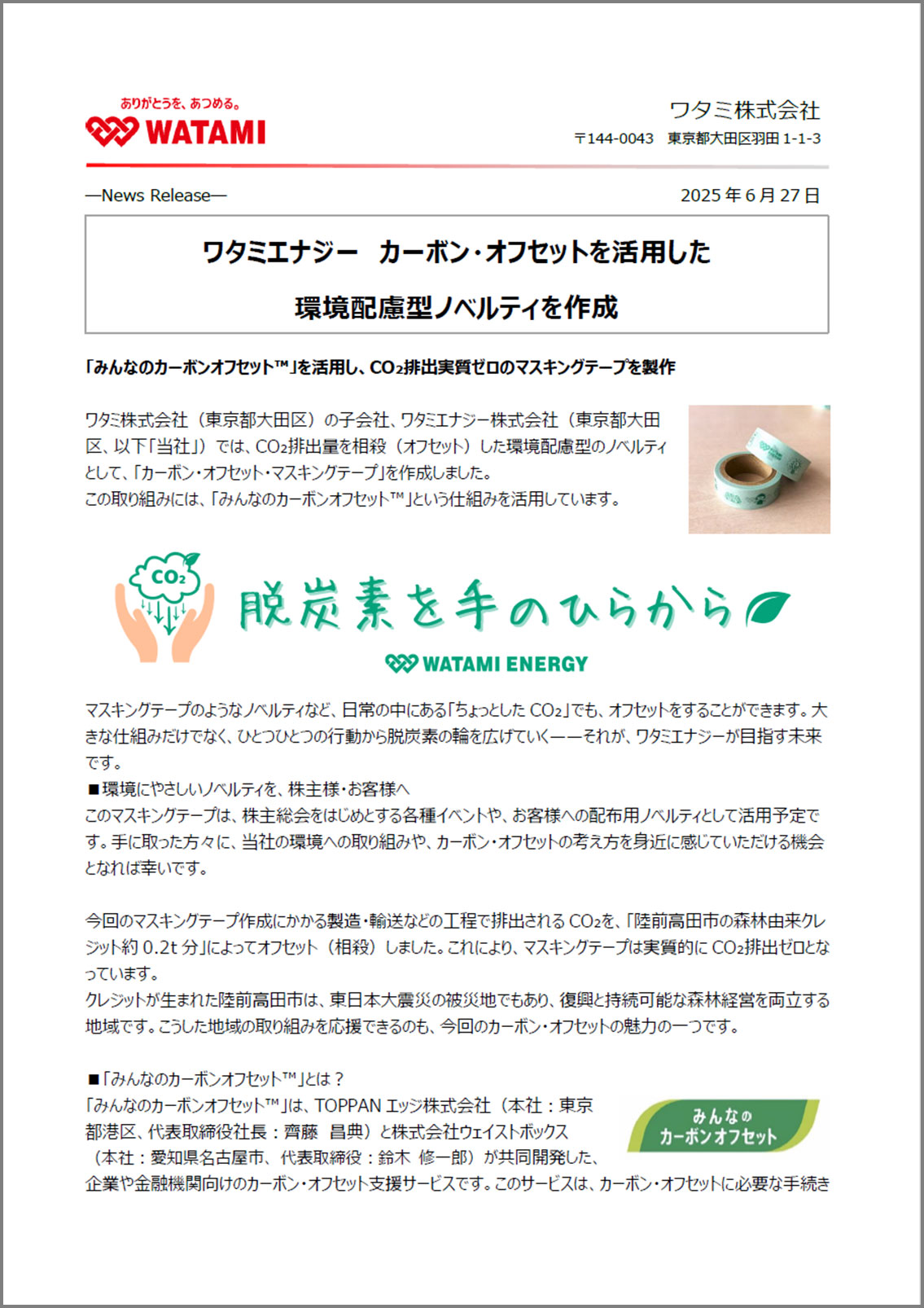 ワタミエナジーでは、CO₂排出を相殺(オフセット)した「カーボン・オフセット マスキングテープ」を作成しました。製造や輸送などで排出されるCO₂約0.2tを、陸前高田市の森林クレジットでオフセットし、実質排出ゼロを実現しています。この取り組みには「みんなのカーボンオフセット™」の仕組みを活用しており、「脱炭素を手のひらから」という想いを込めています。マスキングテープは、株主総会やイベントで配布し、日常の中で楽しく使えるノベルティを通じて、カーボン・オフセットをもっと身近に感じていただける機会となることを目指しています。