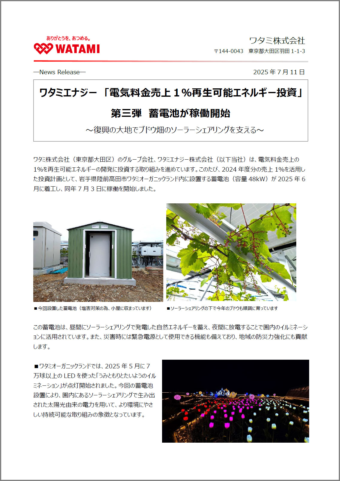 ワタミエナジーでは、電気料金売上の1%を再生可能エネルギーの開発に投資する取り組みを進めており、このほど2024年度分の投資として岩手県陸前高田市・ワタミオーガニックランド内に48kWの蓄電池を設置しました。
