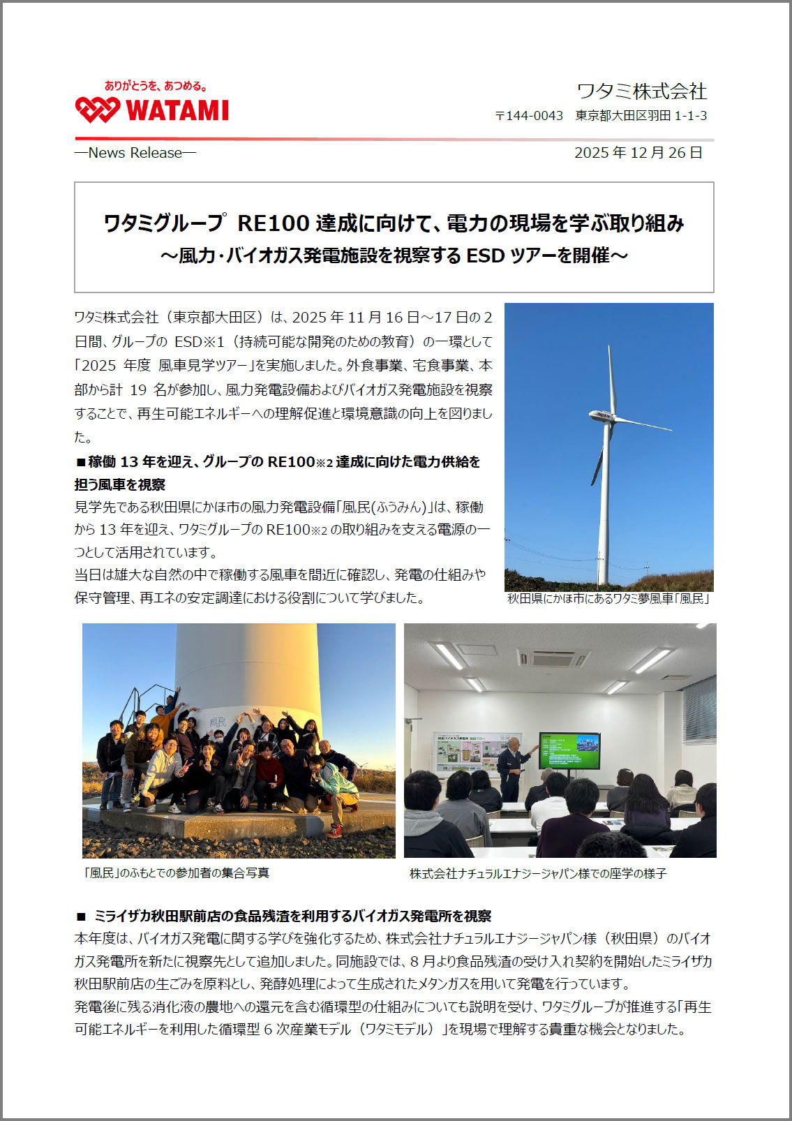 ワタミエナジーは、ワタミグループが取り組むESD(持続可能な開発のための教育)の一環として、2025年11月16日~17日の2日間、秋田県にかほ市にて「2025年度 風民ツアー」を実施しました。本ツアーには外食事業・宅食事業・本部など、部門の垣根を越えて計19名が参加しました。